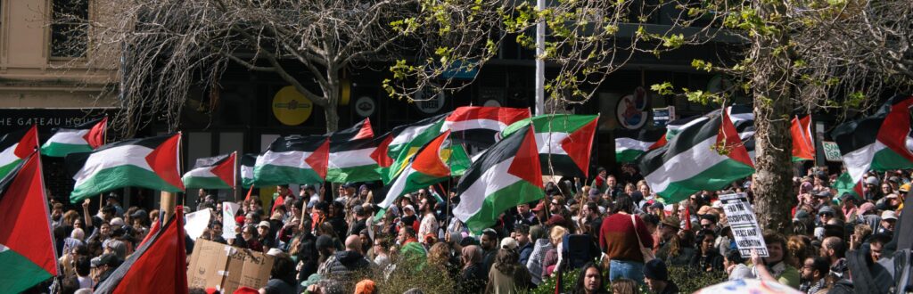 Banner Image: People rallying at one of the many Tāmaki Makaurau rallies for Palestine. Photo credit: Rudi Karmakar.